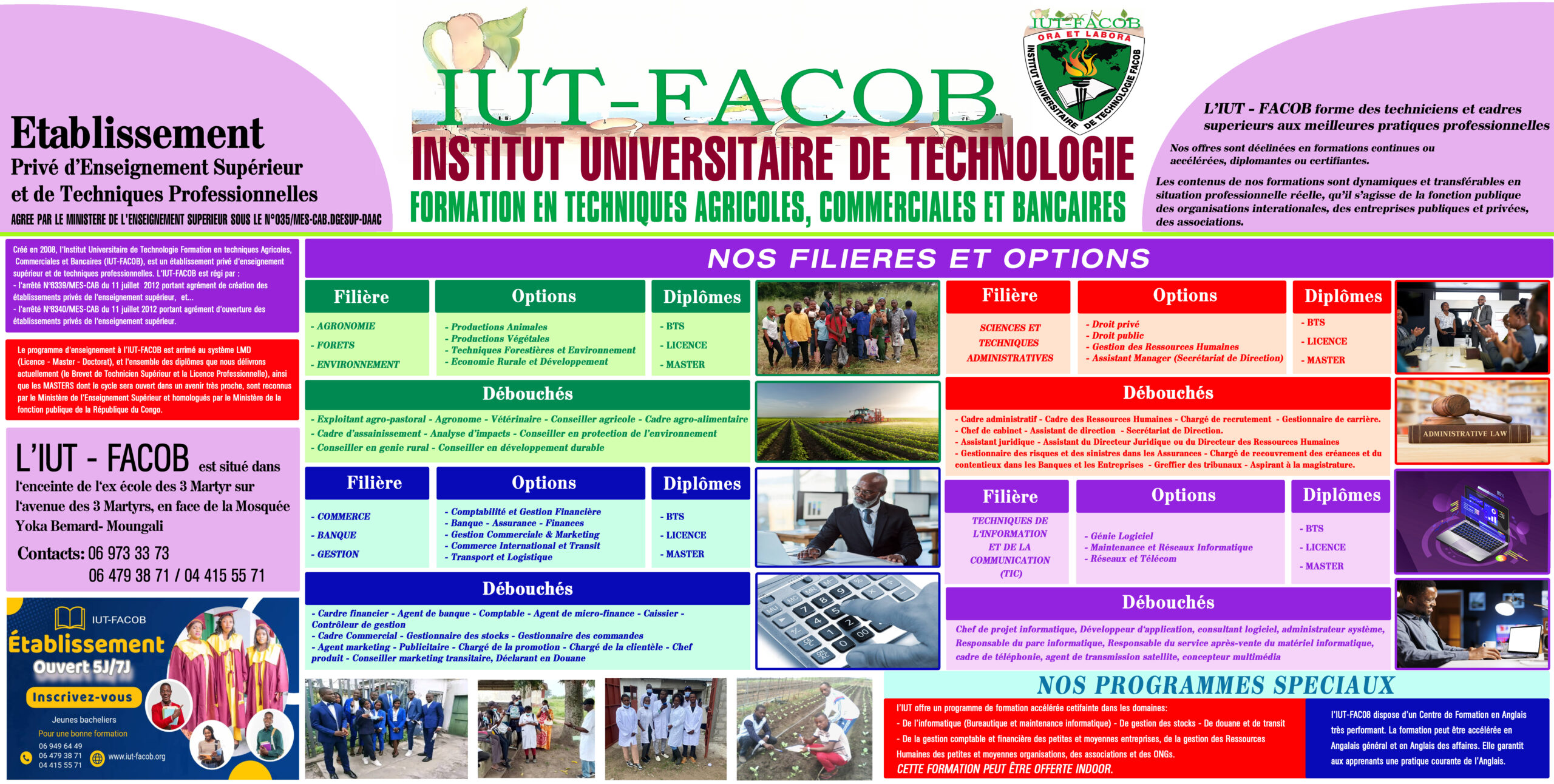 IUT-FACOB est un Etablissement Privé d’Enseignement Supérieur et de Techniques Professionnelles. Il vous assure un meilleur avenir. A l’IUT-FACOB, votre formation vous permettra de devenir un Cadre financier, un Agent de banque, un Comptable, un Déclarant en douane, un Assistant judiciaire, un Gestionnaire des Ressources Humaines, un Assistant Manager, un Informaticien, un Agronome, un Apiculteur.